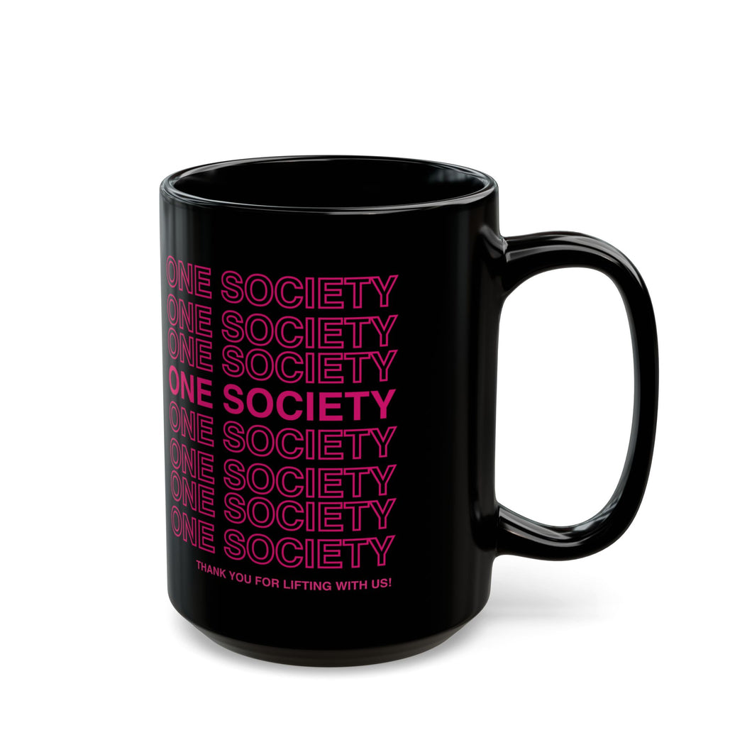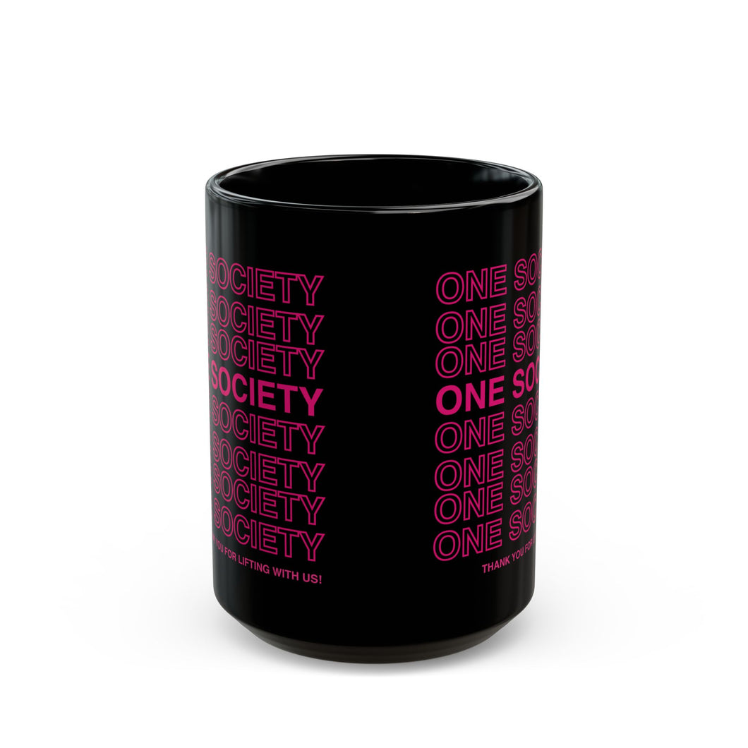 Black Mug — 'One Society' Repeat Text Neon Pink Coffee Cup