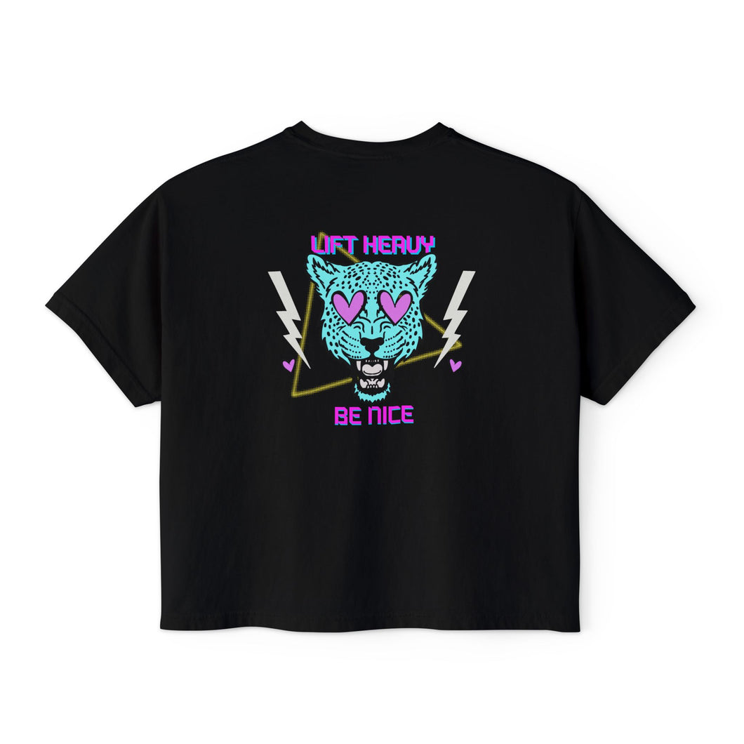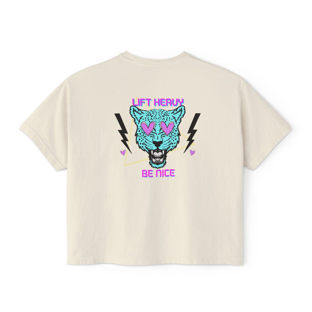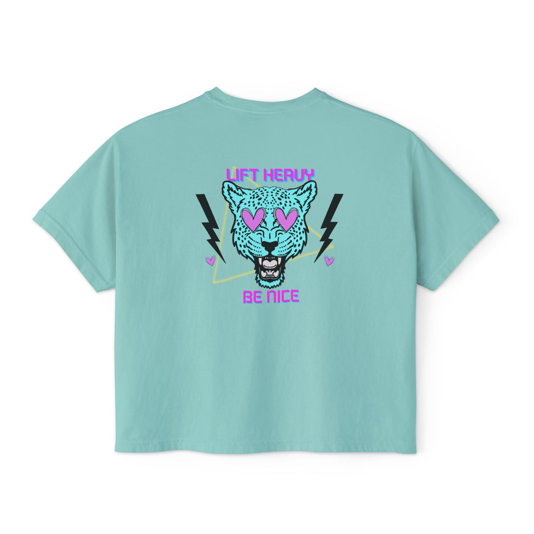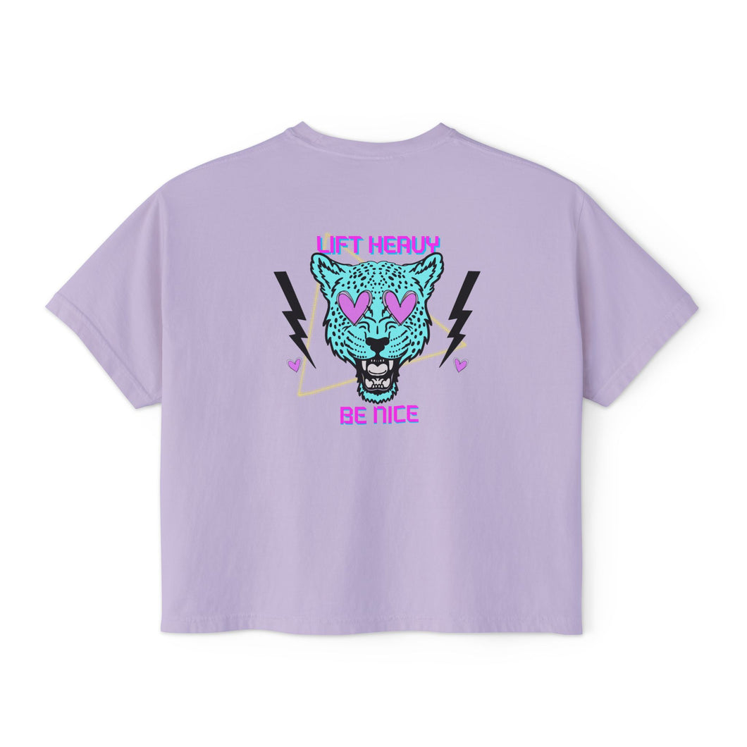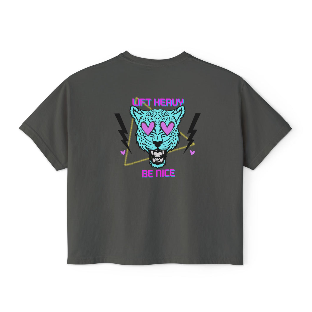 This cropped boxy tee brings bold gym-energy and playful attitude to everyday wear. The front features a small, neon lightning bolt that hints at speed and power. The back pops with a retro-inspired roaring tiger rendered in cyan and magenta, framed by lightning bolts and the phrase “LIFT HEAVY / BE NICE.” It feels loud but friendly — made for someone who pushes hard in the gym but keeps a lighthearted vibe outside of it. Wear it after a heavy set, on the way to a class, or lounging with friends; the heavy weight cotton and pigment-dyed tones give it a lived-in, vintage character that only gets better with time.