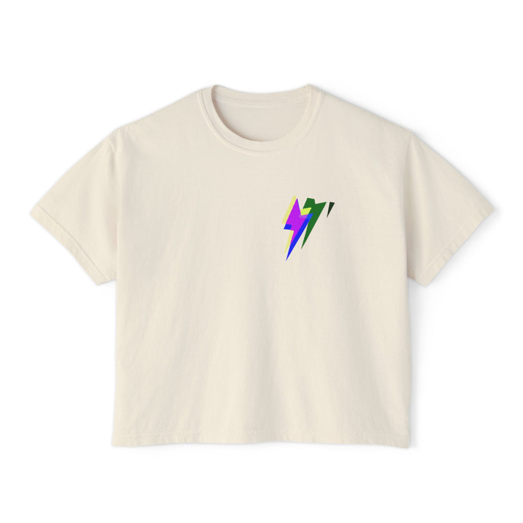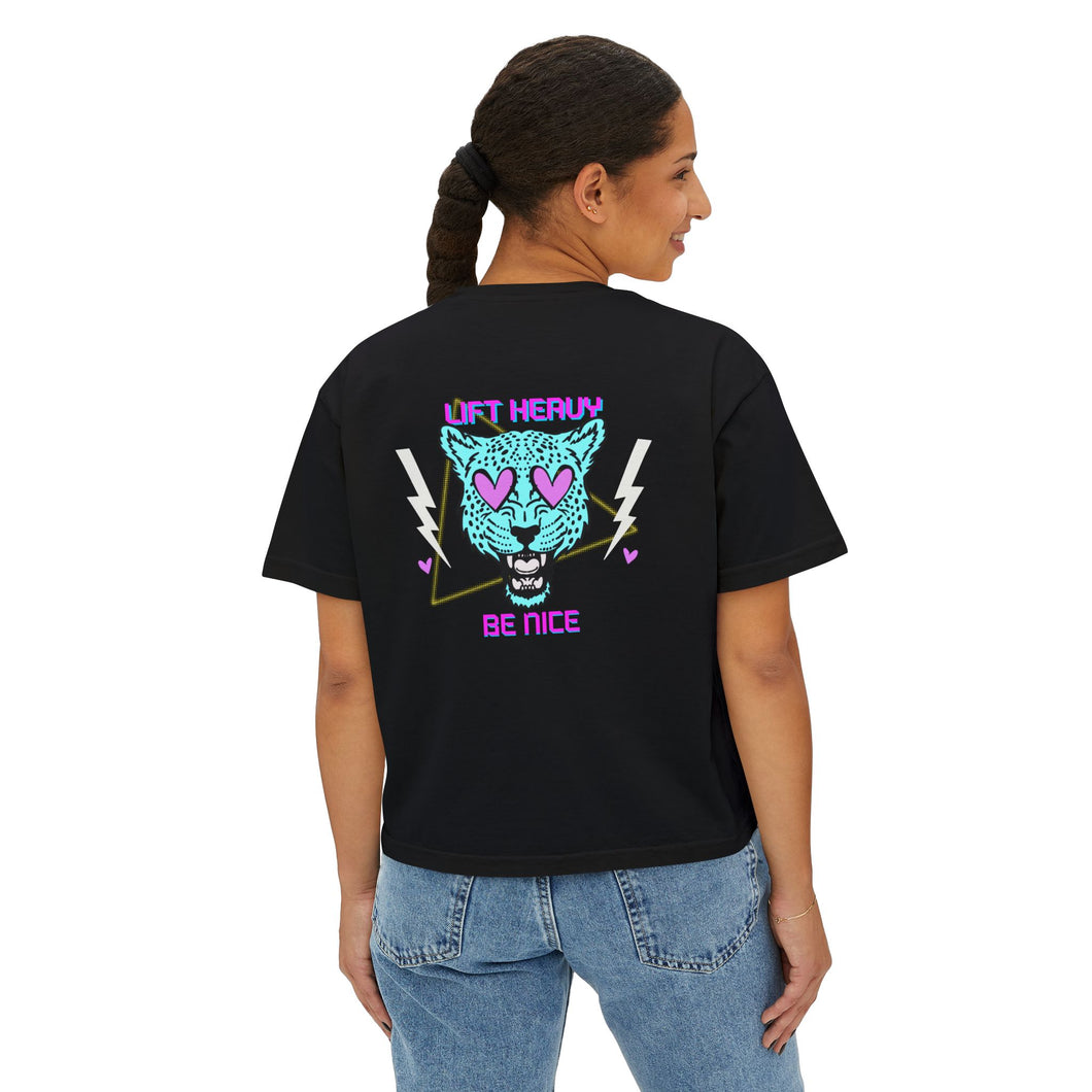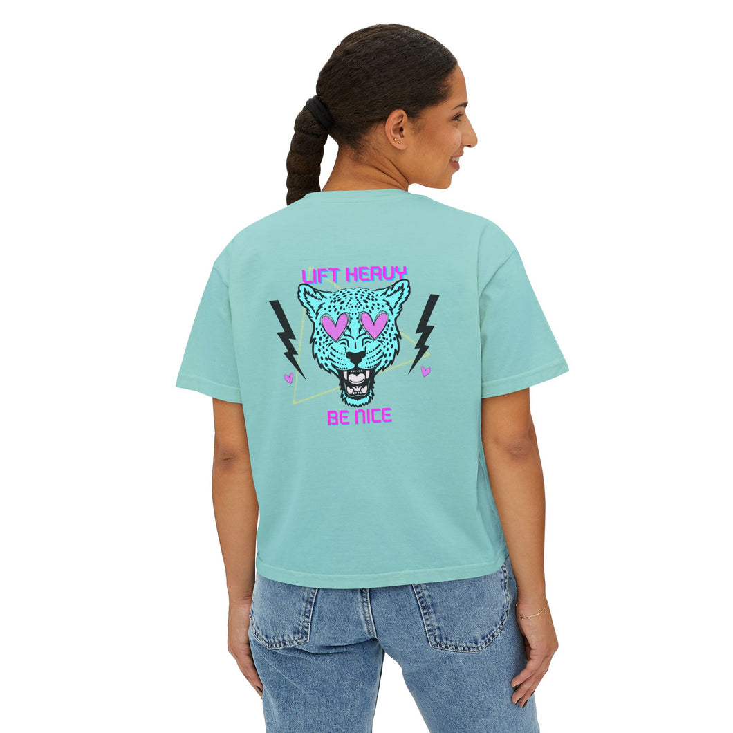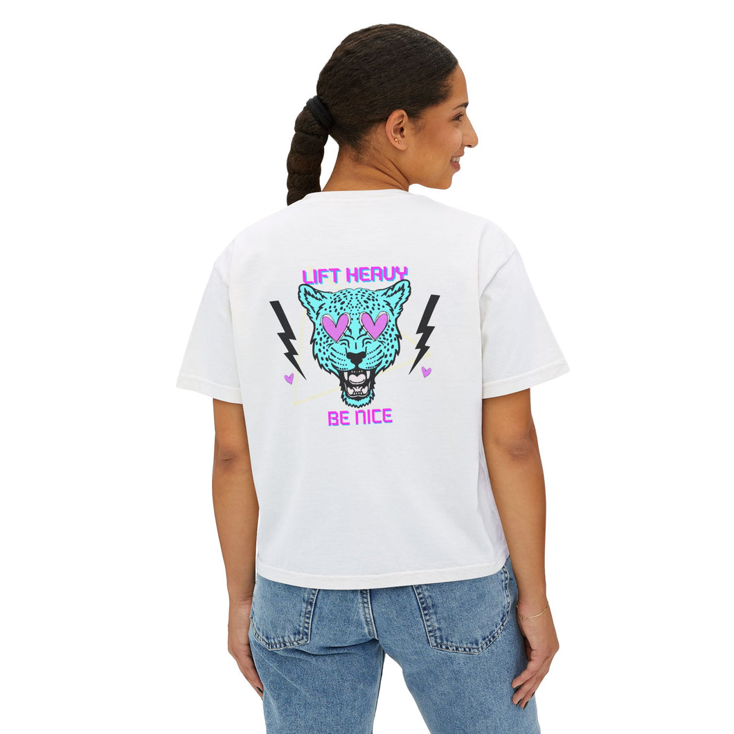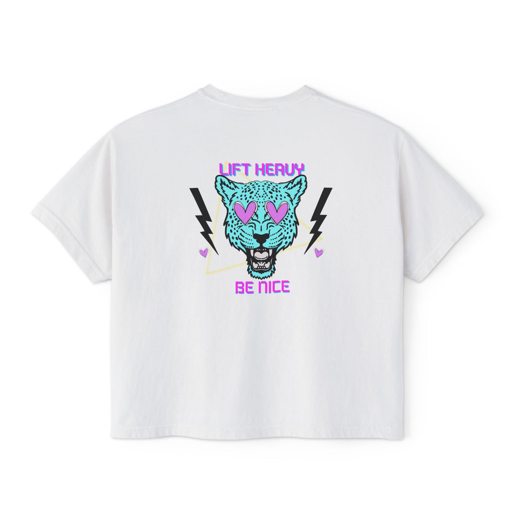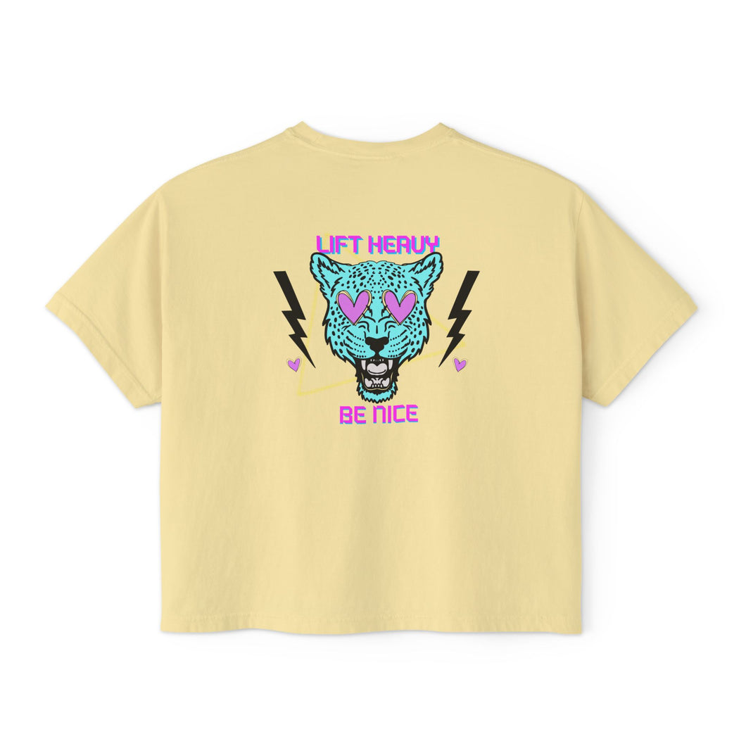 This cropped boxy tee brings bold gym-energy and playful attitude to everyday wear. The front features a small, neon lightning bolt that hints at speed and power. The back pops with a retro-inspired roaring tiger rendered in cyan and magenta, framed by lightning bolts and the phrase “LIFT HEAVY / BE NICE.” It feels loud but friendly — made for someone who pushes hard in the gym but keeps a lighthearted vibe outside of it. Wear it after a heavy set, on the way to a class, or lounging with friends; the heavy weight cotton and pigment-dyed tones give it a lived-in, vintage character that only gets better with time.