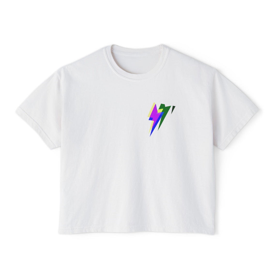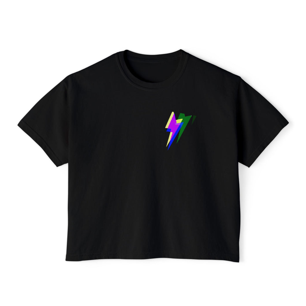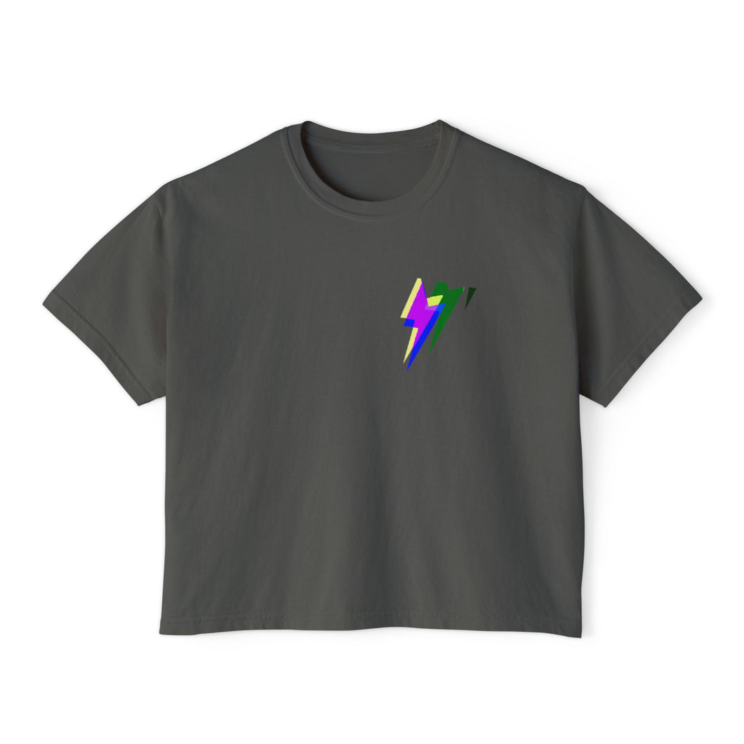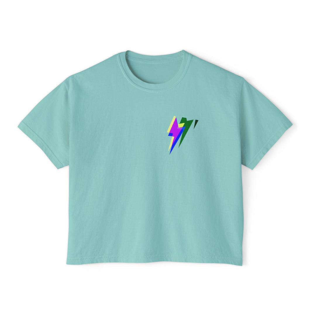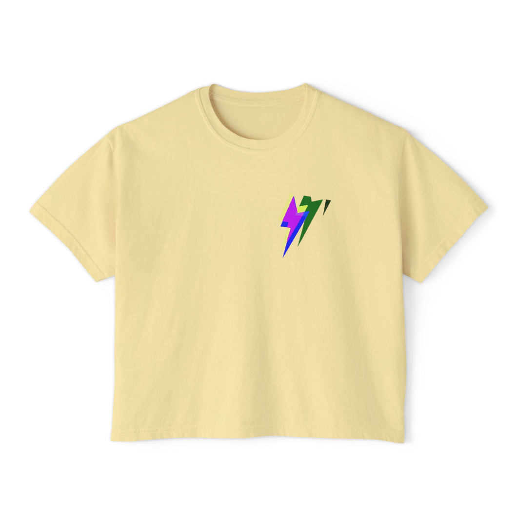 This cropped boxy tee brings bold gym-energy and playful attitude to everyday wear. The front features a small, neon lightning bolt that hints at speed and power. The back pops with a retro-inspired roaring tiger rendered in cyan and magenta, framed by lightning bolts and the phrase “LIFT HEAVY / BE NICE.” It feels loud but friendly — made for someone who pushes hard in the gym but keeps a lighthearted vibe outside of it. Wear it after a heavy set, on the way to a class, or lounging with friends; the heavy weight cotton and pigment-dyed tones give it a lived-in, vintage character that only gets better with time.